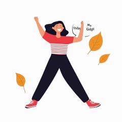 Flat Illustration, Flat Art Style, an illustration of a woman with her arms up in the air and a speech bubble that says my friday, 1girl, long hair, smile, simple background, shirt, black hair, white background, standing, full body, closed eyes, short sleeves, shoes, pants, striped clothes, speech bubble, arms up, black pants, leaf, outstretched arms, red shirt, red footwear, striped shirt, clothes around waist