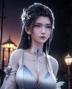 <lora:706-DA-诛仙-陆雪琪-新装束:0.8>(,1girl, ,best quality, ),looking at viewer, ,ultra detailed 8k cg, ultra detailed background,  ultra realistic 8k cg,          cinematic lighting, cinematic bloom, (( , )),,  , unreal, science fiction,  luxury, jewelry, diamond, pearl, gem, sapphire, ruby, emerald, intricate detail, delicate pattern, charming, alluring, seductive, erotic, enchanting, hair ornament, necklace, earrings, bracelet, armlet,halo,masterpiece, (( , )),,  ,cherry blossoms,(((, night,night sky,lamppost,  ultra high res, (photorealistic:1.4), raw photo, 1girl, , rain, sweat, ,wet, )))(( , ))   (cleavage), (),