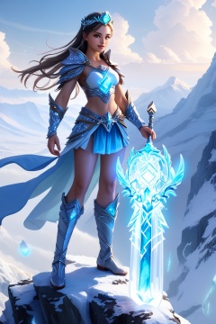 a beautiful girl stands on a hill top. She uses the magic ring and turns into a beautiful ice magic \(ek_ges1ba\) warrior \(detailed exquisite face\),ek_game_3ffect