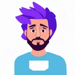 Flat Illustration,  an avatar of a man with purple hair and blue t - shirt on a white background, flat style