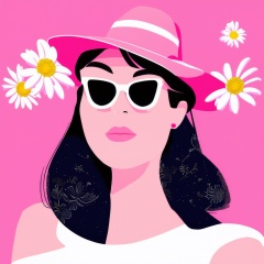 Flat Illustration,  an illustration of a woman wearing sunglasses and a hat in front of daisies on a pink background