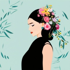 Flat Illustration,  an illustration of a woman in a black dress with flowers in her hair and earrings on her earlobes