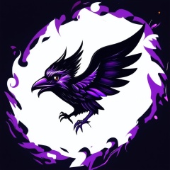 gaming logo design,  an illustration of a raven with purple wings on a white and black background