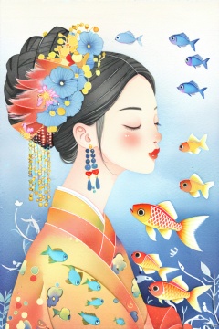 1girl, solo, black_hair, hair_ornament, long_sleeves, jewelry, closed_mouth, closed_eyes, upper_body, flower, earrings, from_side, petals, eyelashes, profile, chinese_clothes, looking_down, animal_print, gem, fish, beads, blue_flower, goldfish, fish_print, koi,L&Y