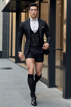 1man,fashion model,male focus,asian,exquisite facial features,handsome,muscular,pectorales,tight shorts,gothic kneehigh socks,full body,Business fashion, (masterpiece, realistic, best quality, highly detailed,profession), jzns,1man,brn