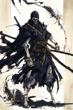 一个骷髅族,白色的骨头,黑色的披风,拿着武器