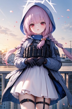 nai3, 11girl,solo,(masterpiece:1.3),( beautiful:1.2),(high quality:1.2),(finely detailed:1.2),extremely detailed CG unity 8k wallpaper,best quality,a very delicate and beautiful,perfect fingers,(one cute girl at the center:1.2), 1girl, solo, long hair, looking at viewer, bangs, red eyes, gloves, long sleeves, bow, holding, standing, jacket, pink hair, purple hair, braid, flower, cowboy shot, outdoors, sky, black gloves, hood, petals, thigh strap, halo, hooded jacket, hood up, bouquet, holding bouquet, long hair, bangs, red eyes, gloves, long sleeves, jacket, purple hair, braid, black gloves, hood, twin braids, halo, white jacket, hooded jacket, hood up, low twin braids, bulletproof vest, cross-laced sleeves,atsukoBA