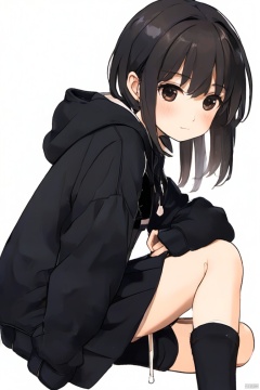 1girl, solo, looking at viewer, blush, bangs, skirt, simple background, socks, black hoodie, loose socks,loli