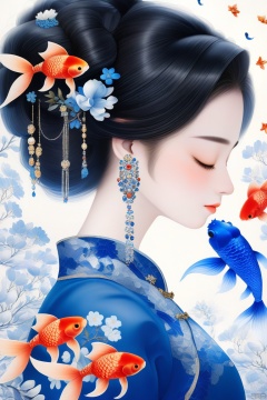 hf,1girl, solo, black_hair, hair_ornament, long_sleeves, jewelry, closed_mouth, closed_eyes, upper_body, flower, earrings, from_side, petals, eyelashes, profile, chinese_clothes, looking_down, animal_print, gem, fish, beads, blue_flower, goldfish, fish_print