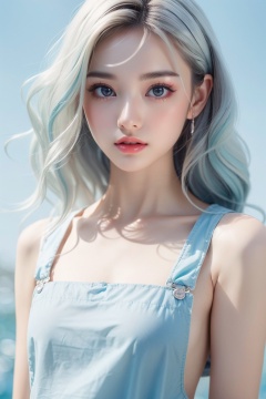 (fashion photography:1.3),(sweet:1.2),This is an image of a person with a very stylized and artistic appearance. The individual has long,(wavy hair with a mix of Bluish and white colors:1.1),which gives off a soft and whimsical vibe. They are wearing what appears to be a light-colored,possibly Bluish,top with a ruffled neckline. The overall aesthetic is very cute and playful,with a focus on pastel colors,quality. The background is simple and does not distract from the subject,which is the person's face and upper body,Short hair,masterworks,highest picture quality,