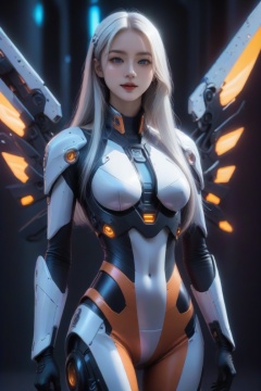 masterpiece, best quality, realistic, full body, 1girl, solo, long hair, standing, white hair, cowboy shot, Cyberpunk background,  looking at viewer, FuturEvoLabMecha, FuturEvoLabCyberpunk,