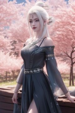 photo_\(medium\),(8k, RAW photo, best_quality),(masterpiece:1.2),(realistic:1.2),(photorealistic:1.3),(ultra-detailed),(extremely_detailed_cg_8k_wallpaper),(crystal_texture_skin:1.3),(shiny:1.2),(shiny_skin:1.4),(extremely_delicate_and_beautiful),petals,flower,sky,cherry blossoms,falling petals,fair skin,landscape,full_shot,shenfengXiaoBaiSecondClothing,1girl,solo,dress,detached sleeves,white hair,standing,arms at sides,torogao,breasts,hair bun,chinese clothes,jewelry,hair ornament,earring,realistic,looking at viewer,<lora:shenfengXiaoBaiSecondClothing_20240804163414-000004:0.7>,