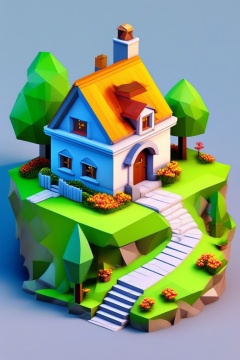 lopy, low poly, flower, outdoors, tree, no humans, window, blue background, grass, building, scenery, stairs, door, bush, house, path, chimney, grey background