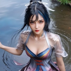 <lora:707-DA-XL-斗罗大陆-唐舞桐:0.8>(,1girl, ,best quality, ),looking at viewer,  ,(Highest picture quality), (Master's work), full body, (ultra-detailed), the portrait is centered, 1girl, raiden shogun, nsfw, (wet clothes), blush, bare hips, (sheer shirt), (from above:1.7), (translucent dress), water drop, (rain), (outdoors), stained, wet hair, wet dress, wet, scenery, (long hair), nature background, close up, ((on back)), water,masterpiece, best quality, ultra high res, highly detailed, (abstract expressionism art:1.4), [girl | fire ghost:10], love,, dark rainbow theme, colorful, visually stunning, beautiful, gorgeous, emotional, intricate, perferct shading, rainbow hair,upper body,(cleavage),
