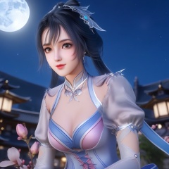 <lora:707-DA-XL-斗罗大陆-唐舞桐:0.8>(,1girl, ,best quality, ),looking at viewer,  ,ultra detailed background,ultra detailed background,ultra realistic 8k cg,, ,masterpiece, (( , )),, ,   ,   cure blossom, full moon,night,night sky,  (cleavage), (), ,,