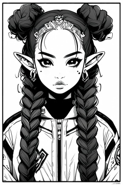 Manga style illustration, line art, pencil art, 1girl, long hair, looking at viewer, white background, closed mouth, jewelry, jacket, upper body, monochrome, braid, heart, earrings, greyscale, pointy ears, hair bun, twin braids, eyelashes, double bun, border, piercing, facial mark, thick eyebrows, ear piercing