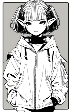 Manga style illustration, line art, pencil art, 1girl, looking at viewer, short hair, simple background, hair ornament, closed mouth, jewelry, jacket, upper body, monochrome, earrings, greyscale, pointy ears, blunt bangs, border, piercing, ear piercing, zipper, short eyebrows, hands in pockets, zipper pull tab