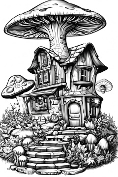 Manga style illustration, line art, pencil art, white background, monochrome, greyscale, tree, no humans, grass, stairs, house, mushroom