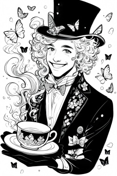 Manga style illustration, line art, pencil art, smile, 1boy, hat, bow, monochrome, male focus, greyscale, cup, facial hair, scar, bug, butterfly, curly hair, teacup, top hat, tea