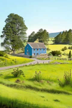charming country house, blue siding, situated, side, road, surrounded, lush green grass, trees, background, creating, idyllic countryside setting, small fence, seen near, rustic charm, main house, two smaller houses visible, further down, road, one closer, left edge, scene, another towards, right, homes contribute, overall picturesque landscape, rural area