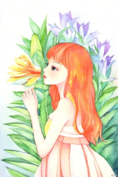 Bestquality,masterpiece,1girl,beautiful_face,eyebrows_visible_through_hair,lily_\(flower\),dress,holding_flower,from_side,watercolor style