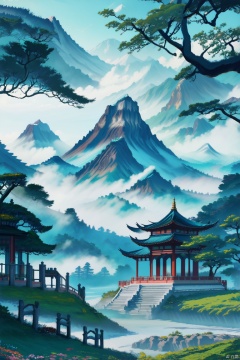 There is a pagoda in the distance, Count Aiminde, a fantasy art in ancient Chinese style, with mountain scenery, misty mist, and blue and green colors