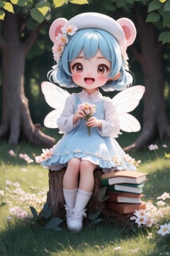 1girl, solo, looking at viewer, blush, smile, short hair, open mouth, bangs, hair ornament, long sleeves, hat, dress, holding, animal ears, brown eyes, sitting, blue hair, full body, flower, :d, outdoors, wings, shoes, socks, hair flower, white dress, blurry, book, depth of field, blurry background, blue dress, beret, white headwear, watermark, brown footwear, grass, bug, white flower, white socks, butterfly, fairy wings, holding flower, fairy, bear ears, book stack, tree stump