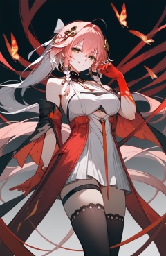 <lora:长离pony:1>,mcchangli,a girl named mcchangli,1girl,bare shoulders,smile,cleavage,white dress,black thighhighs,ponytail,thigh strap,braid,red gloves,, (score_9,score_8_up,score_7_up),(masterpiece,best quality,high quality:1.2),absurdres, prefect lighting, very aesthetic, anime BREAK