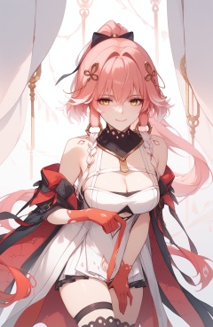 <lora:长离pony:1>,mcchangli,a girl named mcchangli,1girl,bare shoulders,smile,cleavage,white dress,black thighhighs,ponytail,thigh strap,braid,red gloves,, (score_9,score_8_up,score_7_up),(masterpiece,best quality,high quality:1.2),absurdres, prefect lighting, very aesthetic, anime BREAK