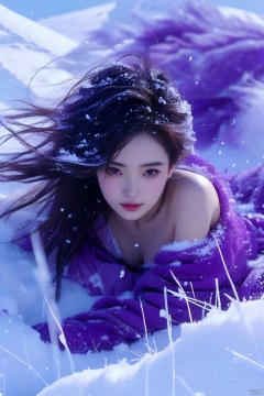 1美女在雪地爬行,凌乱的头发被风吹在脸上,露出大腿,半身,冬天,紫色火焰,绝美容颜,