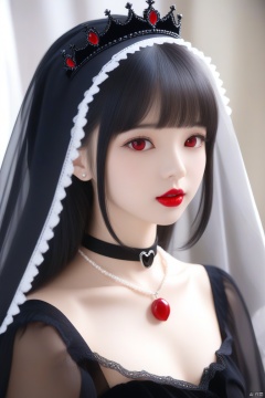 写实风格,人像摄影,这张图描绘了一位单人女性,黑色长发,佩戴面纱,穿着黑色连衣裙。她的妆容逼真,嘴唇涂着红色口红,戴着黑色项圈和皇冠。她的眼睛是黑色的,呈现出自然的上半身姿态,背景模糊,整体风格为亚洲美人的真实描绘。