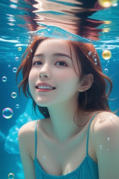 1 girl,medium chest,smile,close-up,solo,underwater,drowning,bubbles,loneliness,struggle,surreal imagery,dreamy atmosphere,contrasting colors,complex and detailed elements,