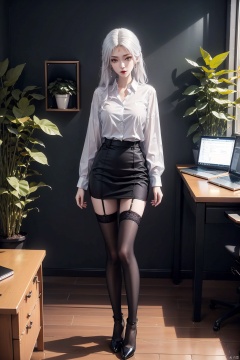 masterpiece, ultra-clear picture quality, real effect, 8k ultra-clear, fine picture effect, ((poakl)),1girl, solo, long hair, breasts, looking at viewer, skirt, shirt, thighhighs, long sleeves, jewelry, medium breasts, closed mouth, standing, full body, white shirt, purple hair, earrings, collared shirt, black thighhighs, indoors, miniskirt, black skirt, nail polish, black footwear, high heels, lips, zettai ryouiki, window, dress shirt, makeup, chair, table, crossed legs, plant, desk, pencil skirt, red lips, potted plant, office lady, computer, monitor, laptop, office,white hair