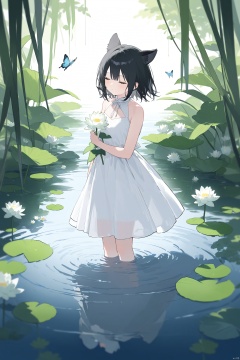 best quality, amazing quality, very aesthetic, absurdres,1girl, solo, black hair, dress, flower, bug, closed eyes, butterfly, lotus, water, bangs, standing, sleeveless, white dress, bare shoulders, letterboxed, long hair, ripples, bare arms, closed mouth, animal ears, sleeveless dress, blurry, lily pad, short hair