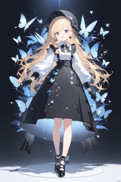 1girl, black_bow, black_skirt, bow, braid, bug, butterfly, earrings, full_body, gloves, hair_bow, hat, jewelry, long_hair, long_sleeves, looking_at_viewer, open_mouth, ribbon, shirt, skirt, smile, solo, standing, suspenders, white_shirt