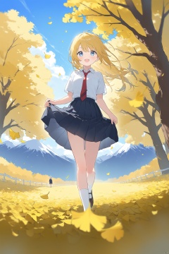 1girl, autumn, autumn_leaves, blue_eyes, blue_sky, blurry, blurry_foreground, cherry_blossoms, clothes_lift, cloud, cloudy_sky, collared_shirt, confetti, curtsey, day, dress_lift, falling_leaves, falling_petals, field, flower, flower_field, ginkgo_leaf, leaf, leaves_in_wind, lifted_by_self, long_hair, looking_at_viewer, mountain, necktie, open_mouth, orange_flower, outdoors, petals, petals_on_liquid, pleated_skirt, red_necktie, rose_petals, school_uniform, shirt, short_sleeve