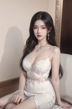 1girl, artist name, bare shoulders, breasts, dress, earrings, jewelry, long hair, looking at viewer, makeup, signature, sitting, solo, white dress,breast,