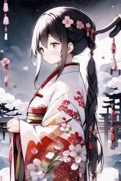 1 girl, Solo, long hair, looking at the audience, blush, Bangs, black hair, hair accessories, long sleeves, shut up, upper body, braids, flowers, Japanese clothing, hair flowers, kimono, looking to the side, patterns, white flowers, red Flower, tassel, White Kimono, printed kimono