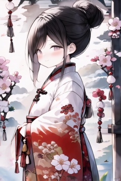 1 girl, Solo, long hair, look at the audience, blush, smile, Bangs, black hair, hair accessories, black eyes, long sleeves, shut up, stand, flowers, side hair, outdoor, Hanfu, hair flowers, wide sleeves, pink eyes, bun, belt, double bun, Chinese dress, print, white flower, Tassel