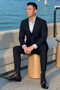 jzns,brn,1man,solo,handsome,asian,male focus,cup, black hair, white shirt, sitting, black pants, brown footwear,(untied bowtie), black glossy socks, hair slicked back,sea,(masterpiece,realistic,best quality,highly detailed),jmsw,brn