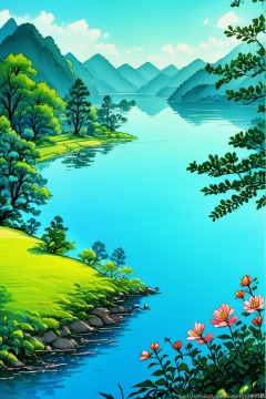 Overlooking effect, 8K, high-definition, hand drawn, marker pen, summer scene, lake water, trees, flowers, adding details, enhancing clarity, extremely high resolution, bright,