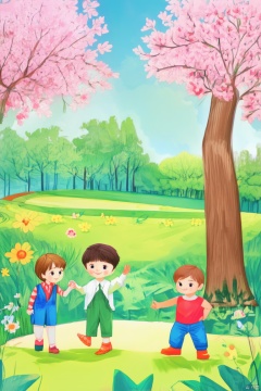 Park, spring, green, healing style, children's hand drawing, pencil drawing, illustrations, bright colors, rich and colorful content, increased details, improved clarity, extremely high resolution