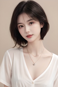 <lora:0804_01:0.6>,<lora:SDXLrender_v2.0:0.6>,(simple background:1.2),close up,face shot,a girl wearing a necklace,tilts her head slightly downward,1 girl,solo,necklace,white shirt,a gentle breeze ruffling her short hair,the necklace glinting in the sunlight,resembling a shining star.,,