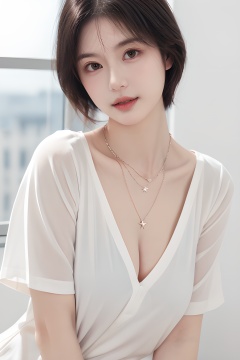 <lora:0804_01:0.7>,<lora:SDXLrender_v2.0:0.6>,<lora:Body_shaping:0.6>,(simple background:1.2),close up,face shot,a girl wearing a necklace,tilts her head slightly downward,1 girl,solo,necklace,white shirt,a gentle breeze ruffling her short hair,the necklace glinting in the sunlight,resembling a shining star.,,