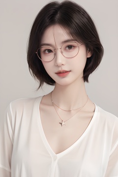 <lora:0804_01:0.7>,<lora:SDXLrender_v2.0:0.6>,(simple background:1.2),close up,face shot,a girl wearing a necklace,tilts her head slightly downward,1 girl,solo,necklace,white shirt,a gentle breeze ruffling her short hair,the necklace glinting in the sunlight,resembling a shining star