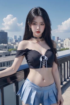 1girl, bandeau, bare shoulders, black choker, blue sky, breasts, choker, cleavage, collarbone, cowboy shot, crop top, day, facial mark, forehead mark, garter straps, grey eyes, jewelry, lips, long hair, looking at viewer, medium breasts, midriff, miniskirt, navel, off shoulder, outdoors, skirt, sky, solo, standing, stomach, thighhighs <lora:美女:0.66>