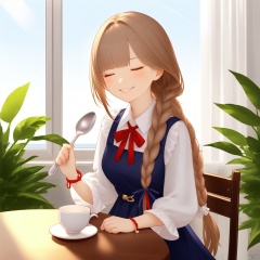nai二次元风格,1girl, solo, closed eyes, sitting, smile, cup, brown hair, red ribbon, ribbon, neck ribbon, shirt, braid, holding, white shirt, bracelet, long hair, spoon, indoors, facing viewer, table, dress, window, jewelry, closed mouth, collared shirt, bow, hair over shoulder, blunt bangs, long sleeves, plant, hair bow, holding spoon, white bow, chair, sleeveless dress, saucer, teacup, sleeveless, single braid, ^_^, coffee