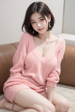 1girl,barefoot, black hair, breasts, brown eyes, collarbone, dress, fishnets, jewelry, large breasts, lips, looking at viewer, necklace, pink dress, pink sweater, short hair, sitting, smile, solo, sweater, yokozuwari trending on pixiv  <lora:NM_FC-Zxiaowu-----小舞姐_2.0:0.66>