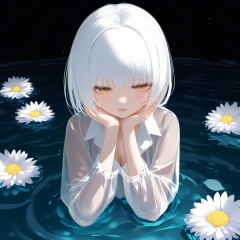 nai二次元风格,一位美丽的年轻女孩,白发短发,有刘海,穿着半透明的长衬衫,双手捧着脸颊,眼中流露出悲伤的神情,泪水顺着脸颊流下。她部分浸在暗水中,周围有波纹。背景为黑色,散布着菊花,女孩的眼睛闪烁着光芒,画面有色差效果,整体呈现出棱彩光辉。