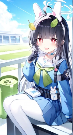 long hair,blush, bangs, skirt, shirt, black hair, red eyes, gloves, long sleeves, animal ears,school uniform, ahoge, pantyhose, pleated skirt, serafuku, black gloves, belt, sailor collar, rabbit ears, blue skirt, neckerchief, fake animal ears, leaf, halo, blue shirt, white pantyhose, white sailor collar, knee pads, leaf on head, binoculars, trash can, blue serafuku,greenneckerchief,miyu\(bluearchive\)